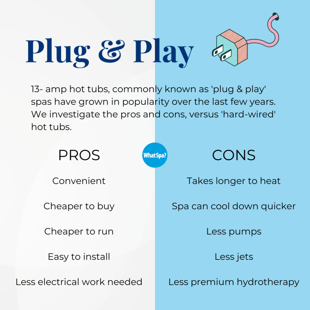 13 amp plug & play spas can run through a standard waterproof RCD-protected three-pronged outdoor socket, shaving a few hundred pounds off the upfront cost of the hot tub.