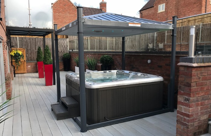 Throughout the UK, a growing network of swim spa and hot tub dealers have been promoting the fact that the Covana design from Canadian manufacturer Canimex Group is the world’s first automated hot tub privacy gazebo that elevates above your swim spa or hot tub at the turn of a key, and there are now numerous examples of how owners are combining the innovative use of this technology to enhance the use of their swim spa.