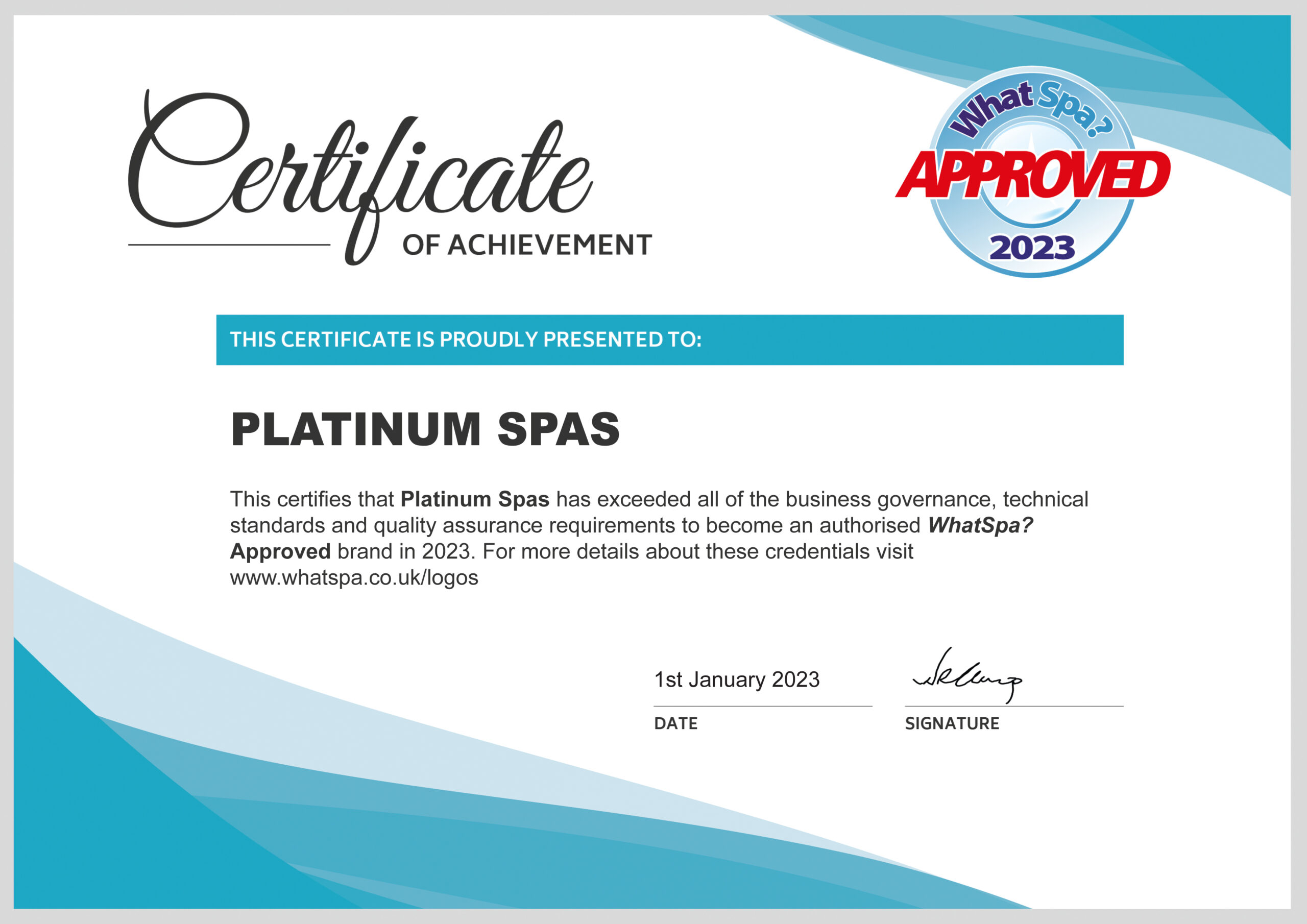 Platinum Spas is a WhatSpa? Approved manufacturer. See our current certificate of approval here.