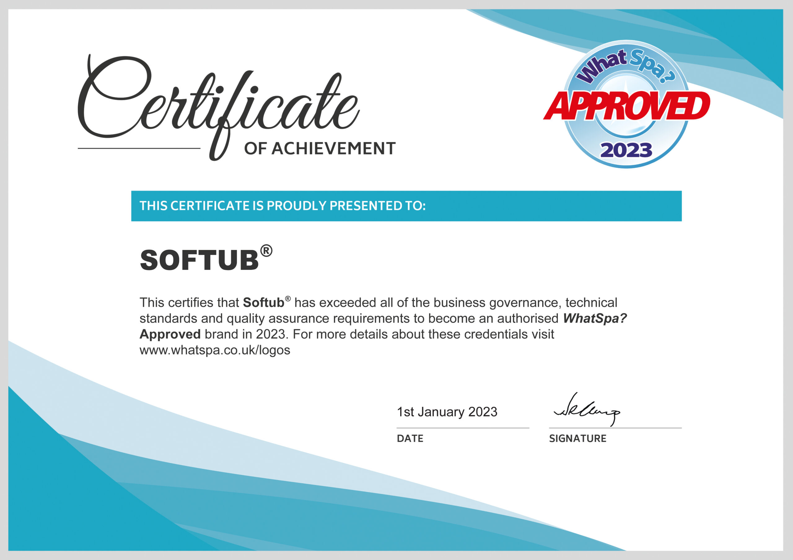 Softub is a WhatSpa? Approved manufacturer. See our current certificate of approval here.