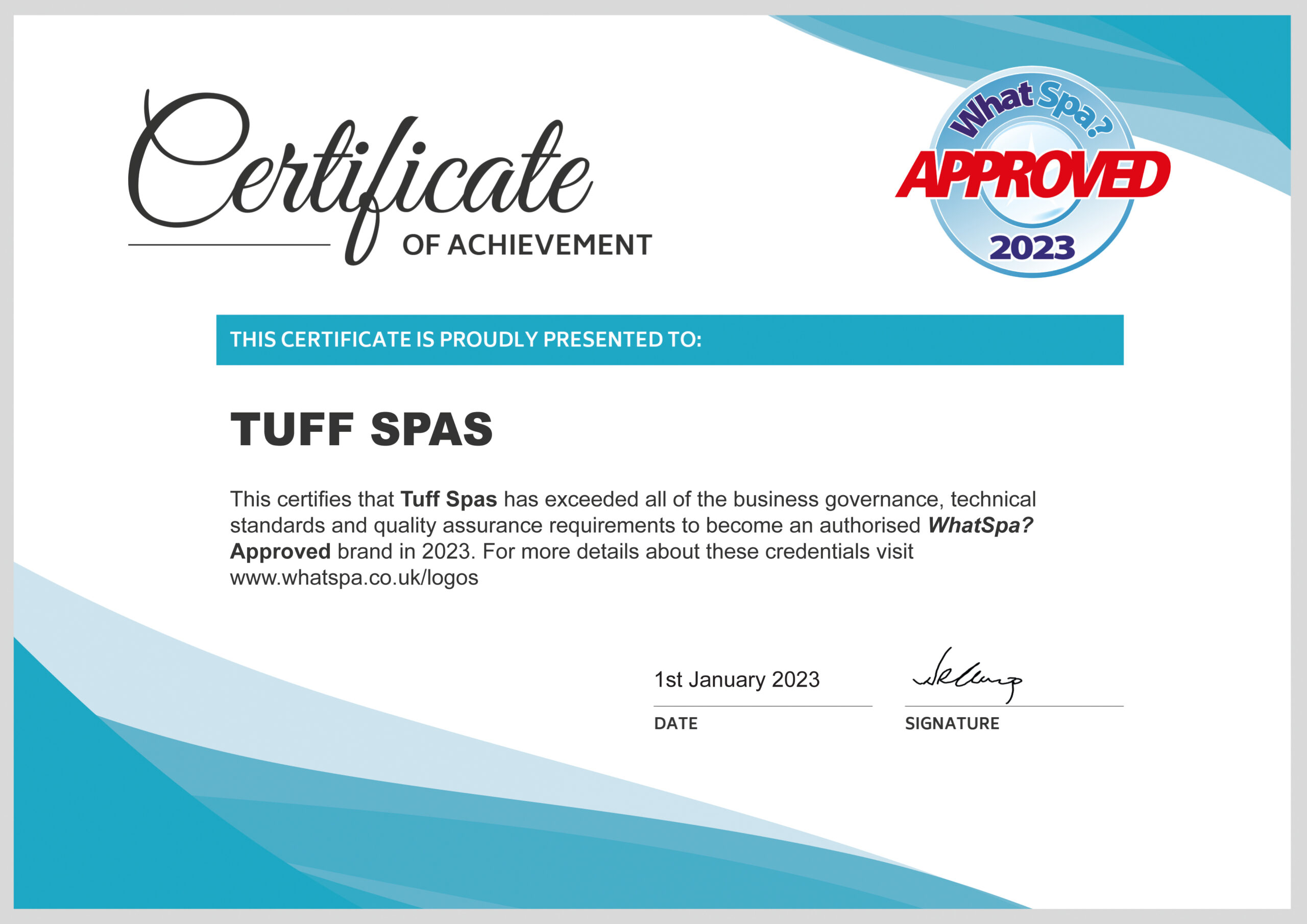 Tuff Spas is a WhatSpa? Approved manufacturer. See our current certificate of approval here.