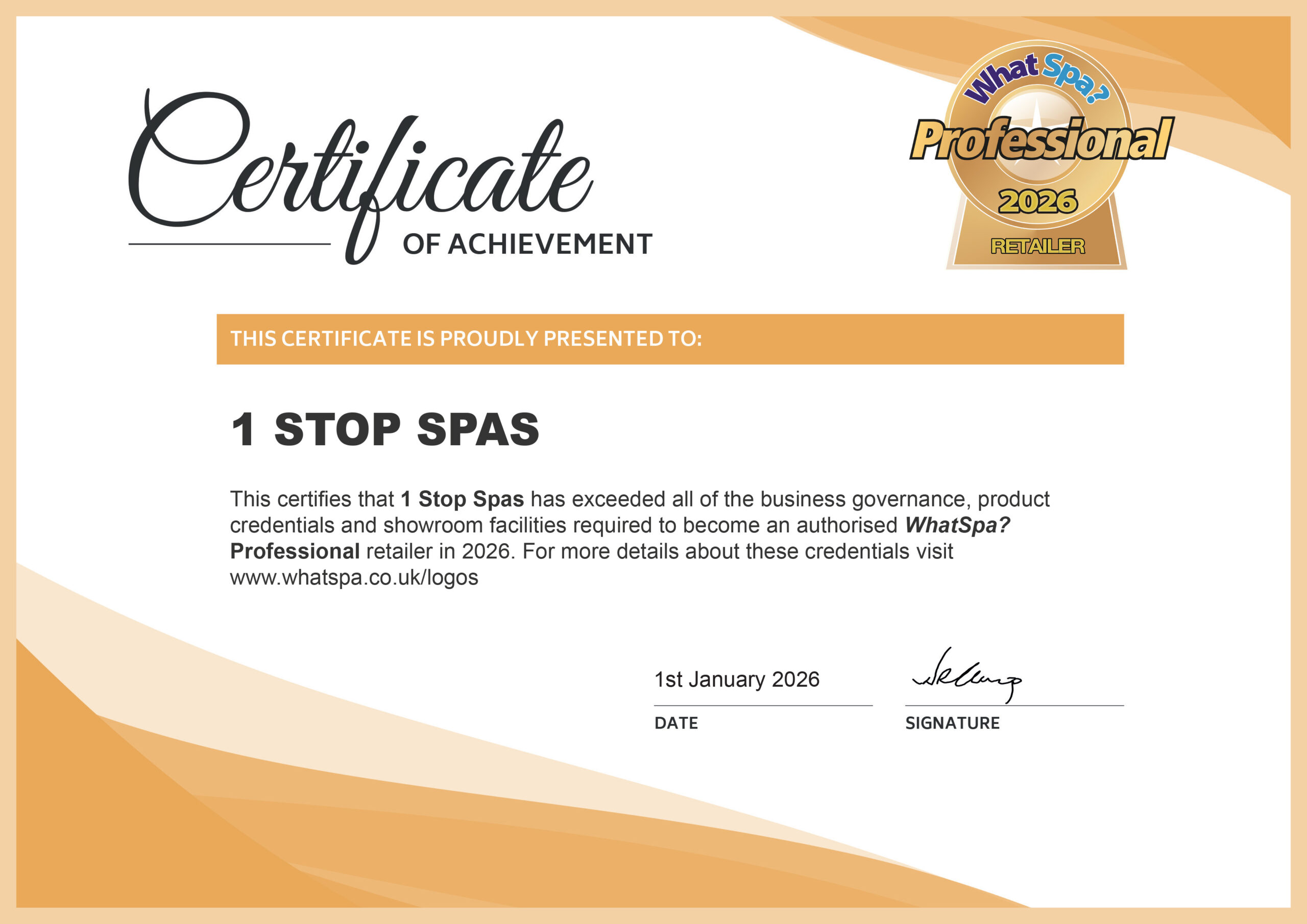 1 Stop Spas is a WhatSpa? Professional retailer. See our current certificate of approval here.