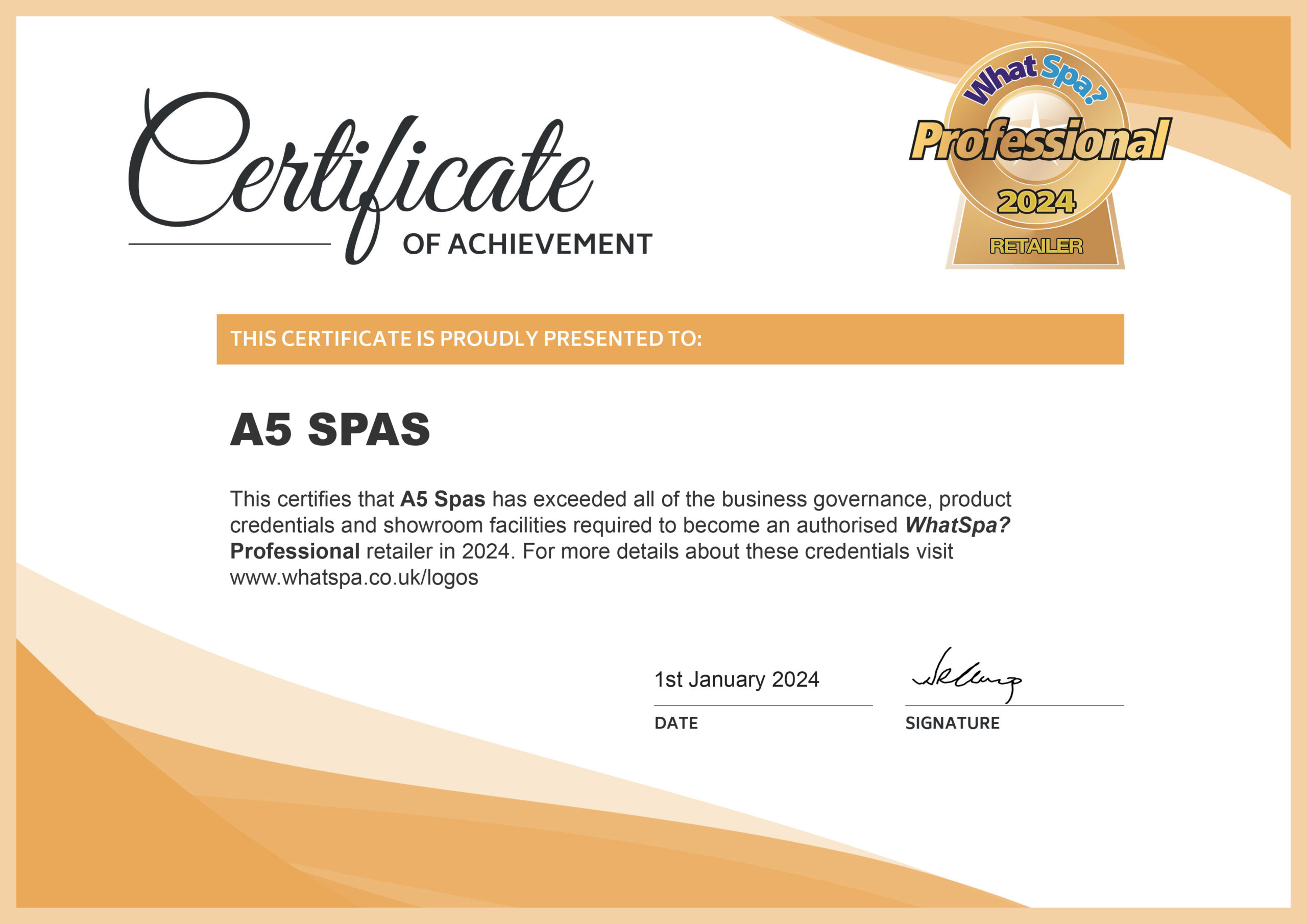 A5 Spas is a WhatSpa? Professional retailer. See our current certificate of approval here.