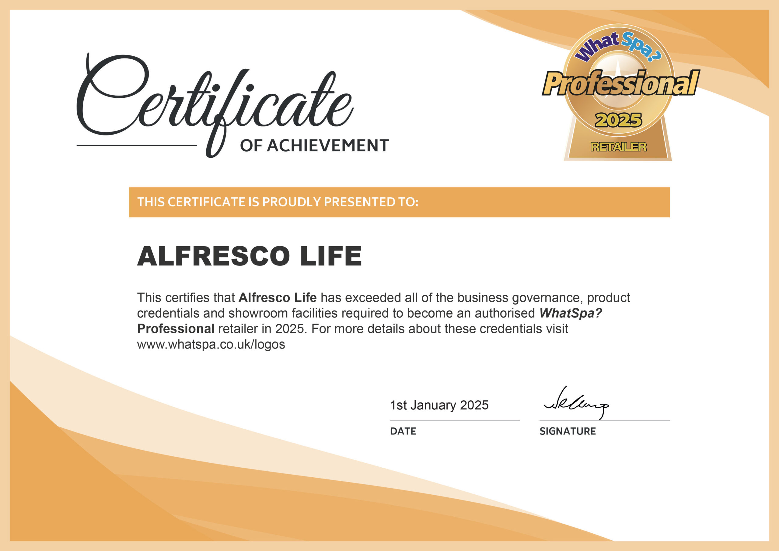 Alfresco Life is a WhatSpa? Professional retailer. See our current certificate of approval here.