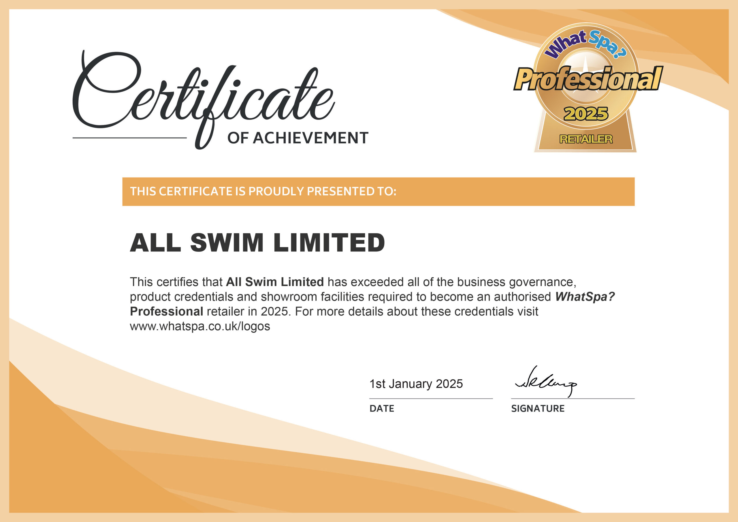 All Swim Ltd is a WhatSpa? Professional retailer. See our current certificate of approval here.
