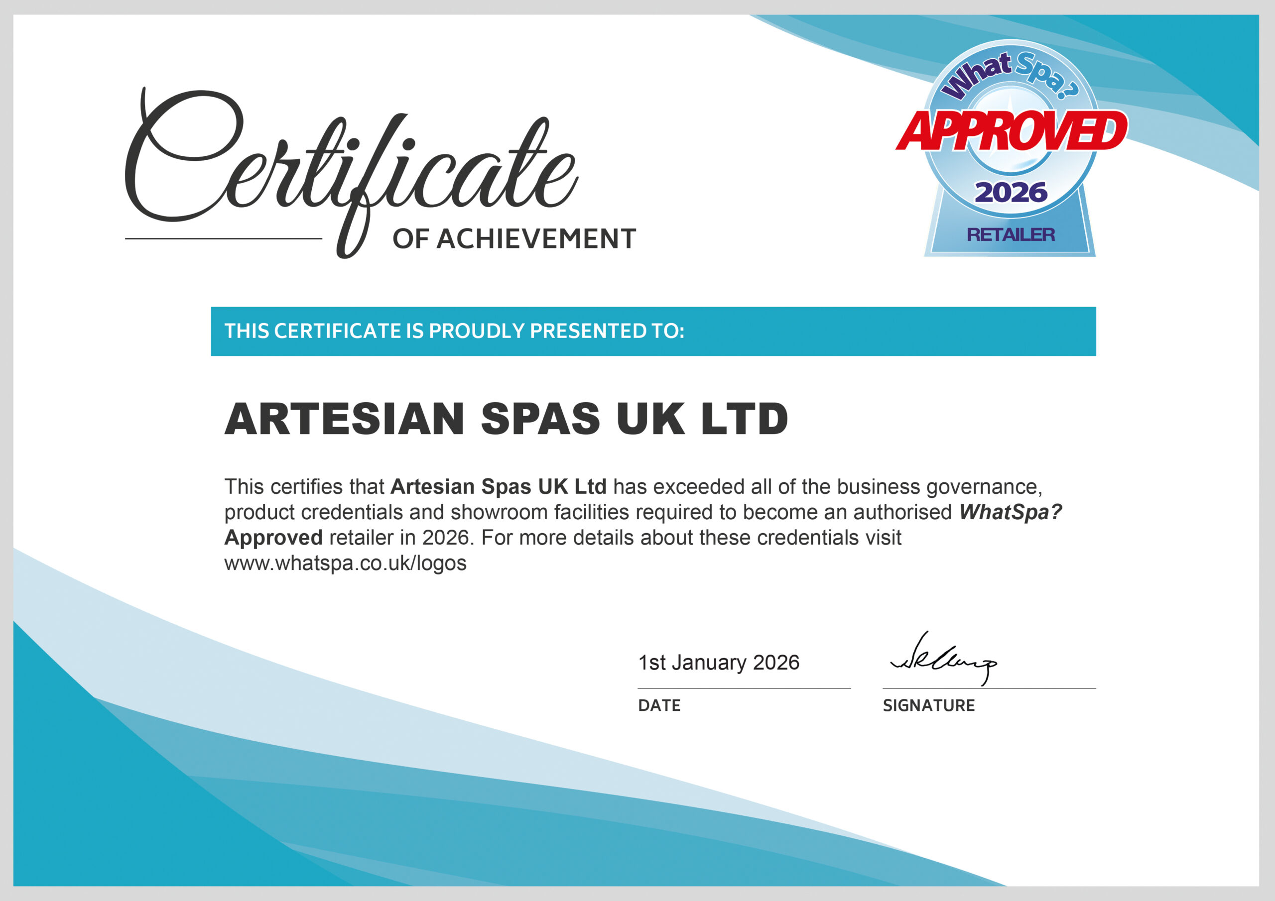 Artesian Spas is a WhatSpa? Approved retailer. See our current certificate of approval here.