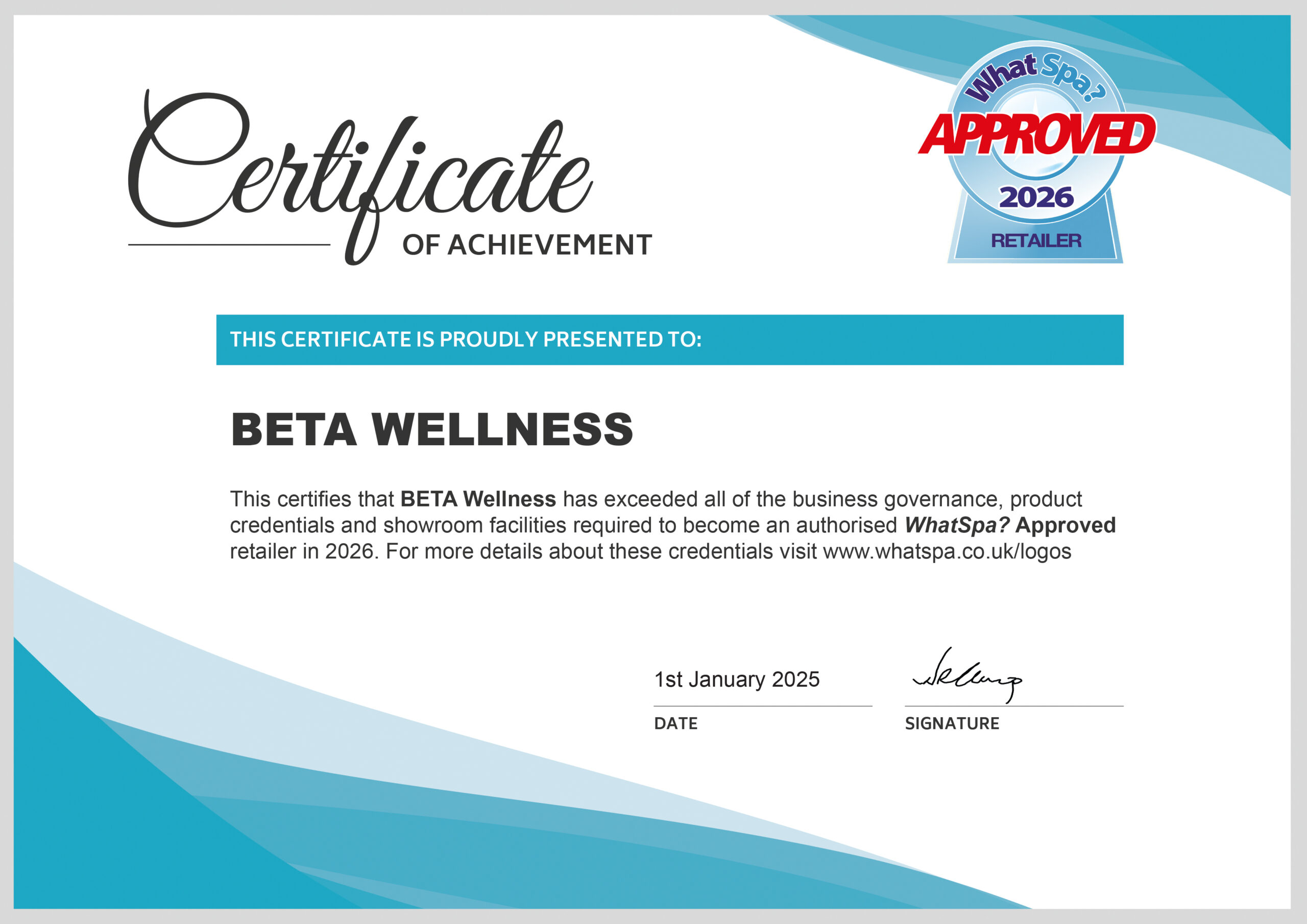 BETA Wellness is a WhatSpa? Approved retailer. See our current certificate of approval here.