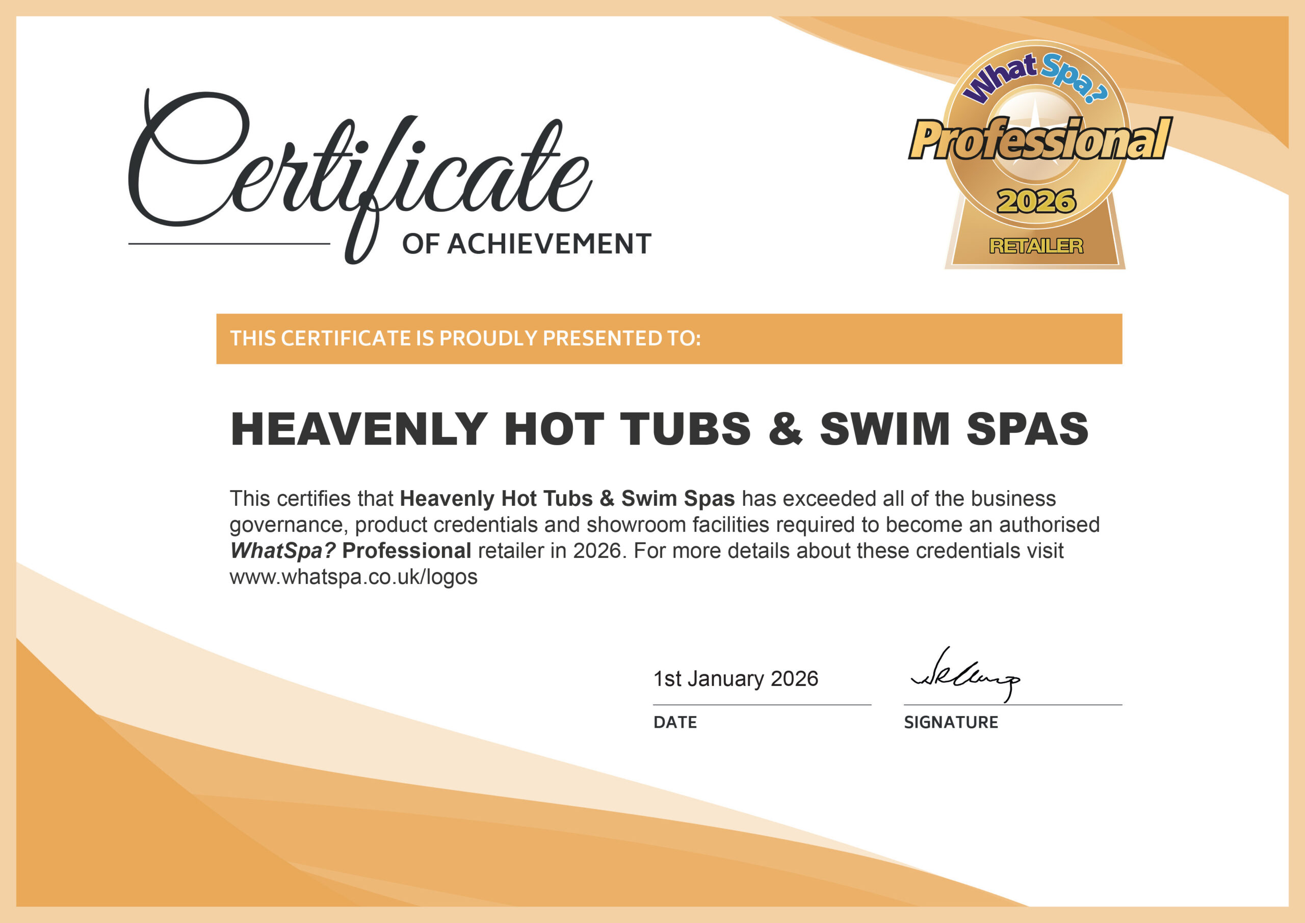 Heavenly Hot Tubs is a WhatSpa? Professionalย retailer. See our current certificate of approvalย here.