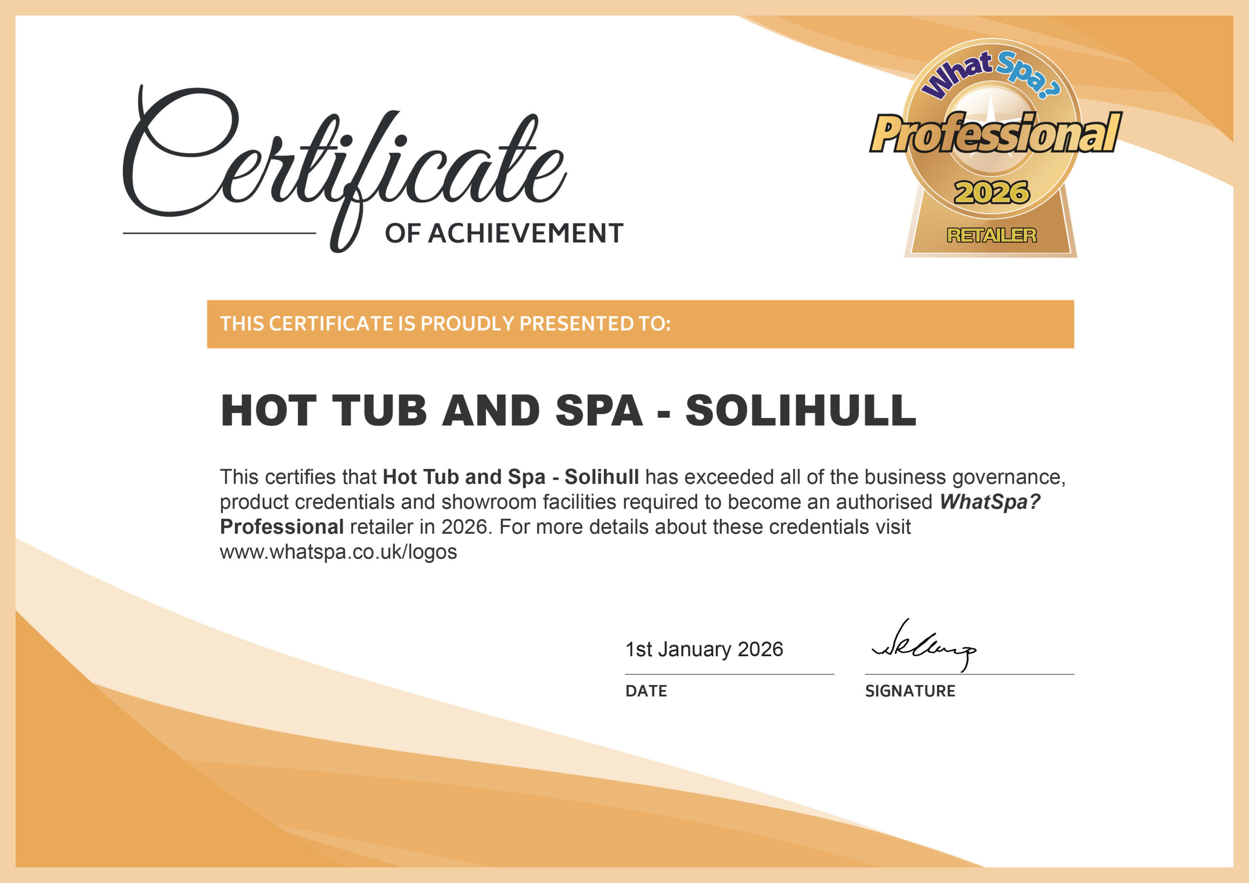Hot Tub and Spa Solihull is a WhatSpa? Professional retailer. See our current certificate of approval here.
