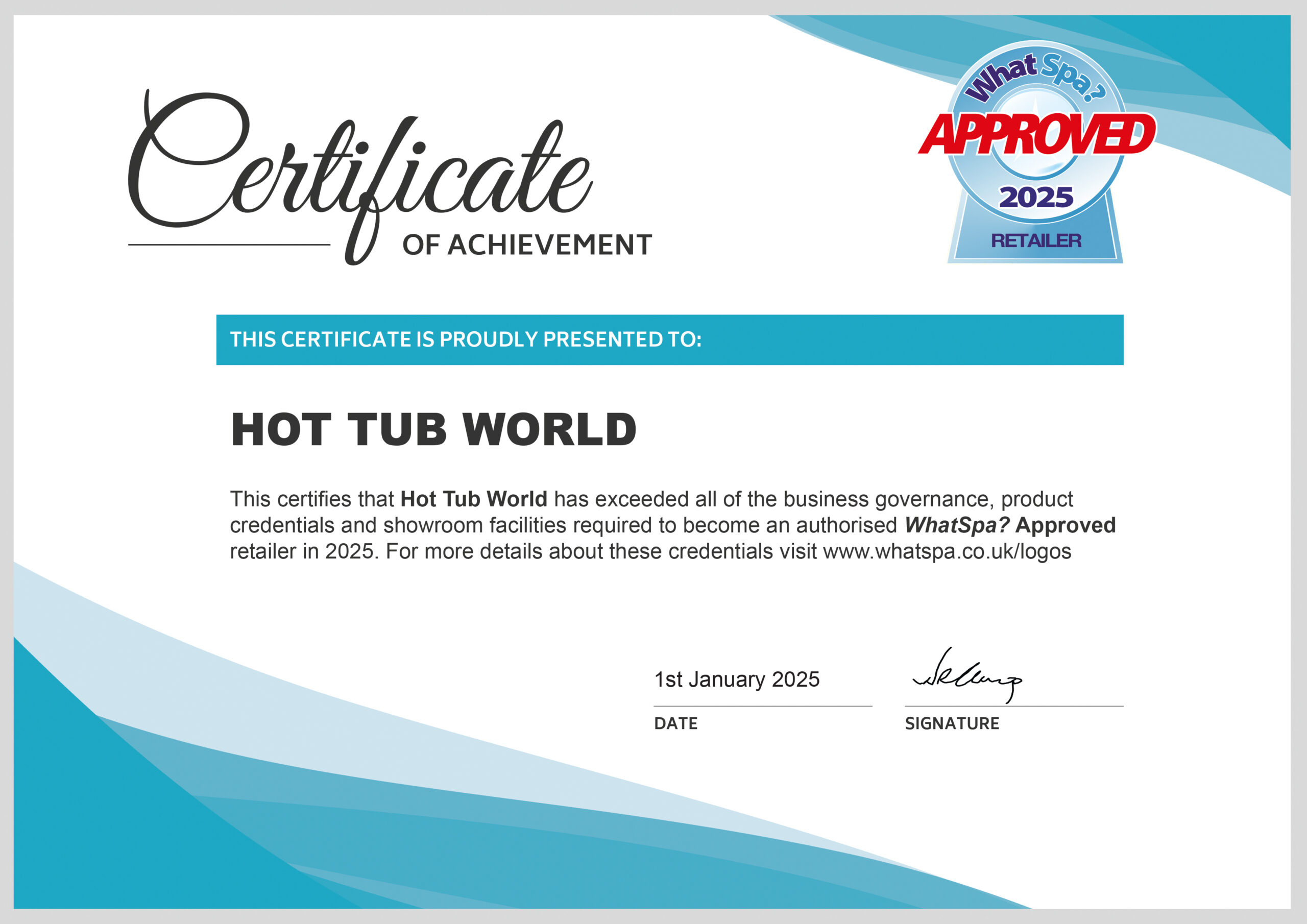 Hot Tub World is a WhatSpa? Approved retailer. See our current certificate of approval here.