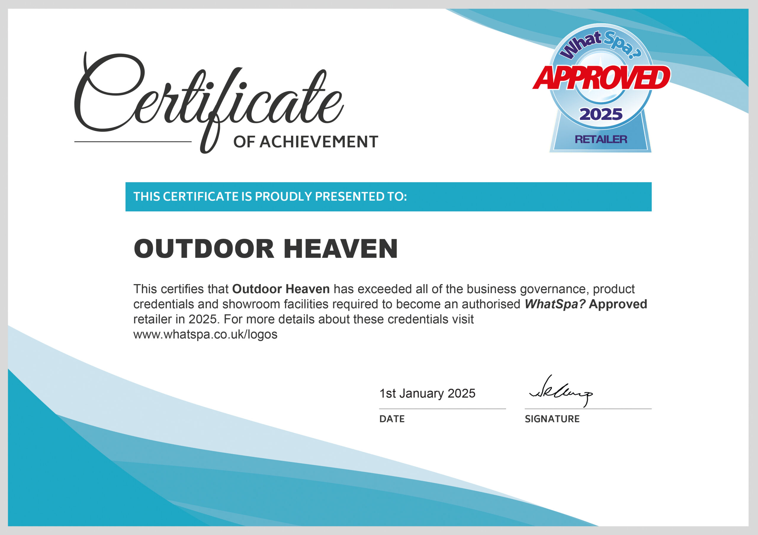 Outdoor Heaven is a WhatSpa? Approved retailer. See our current certificate of approval here.