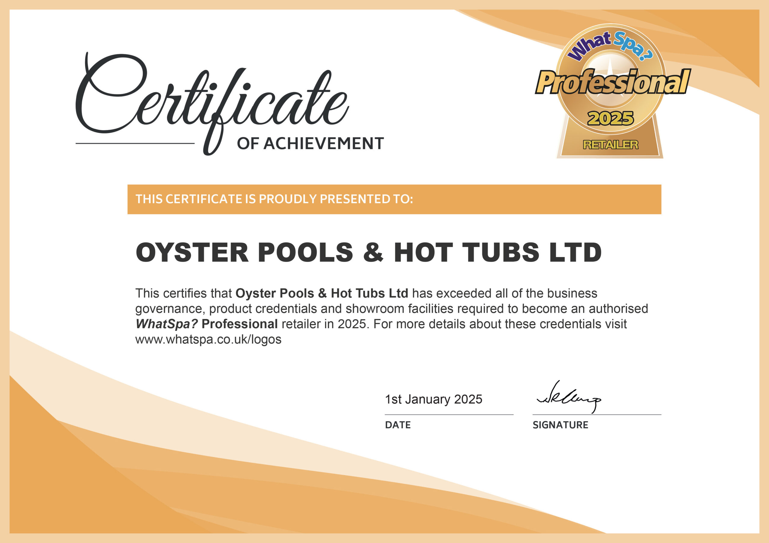 Oyster Pools & Hot Tubs Ltd is a WhatSpa? Professional retailer. See our current certificate of approval here.