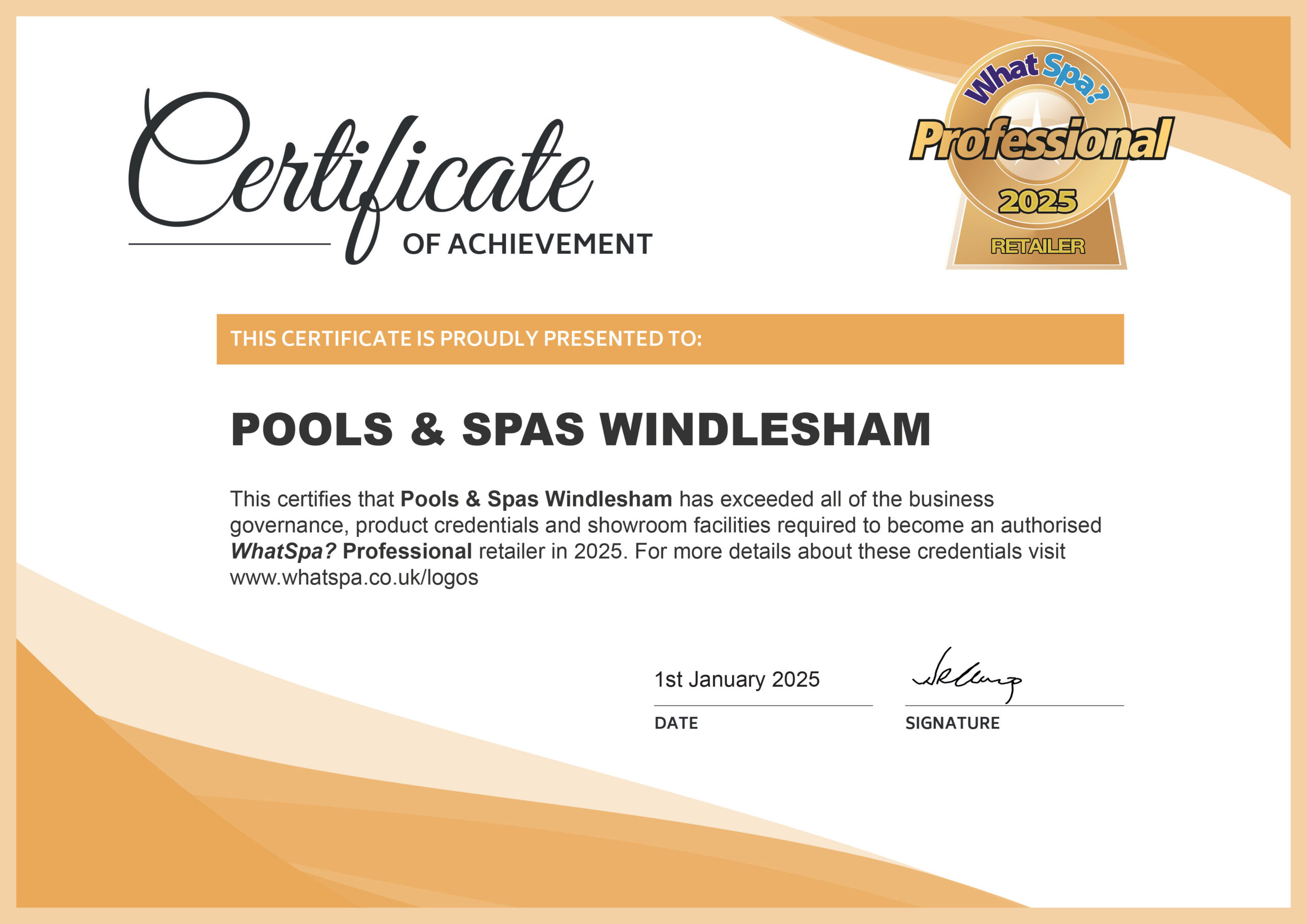 Pools & Spas Windlesham is a WhatSpa? Professional retailer. See our current certificate of approval here.
