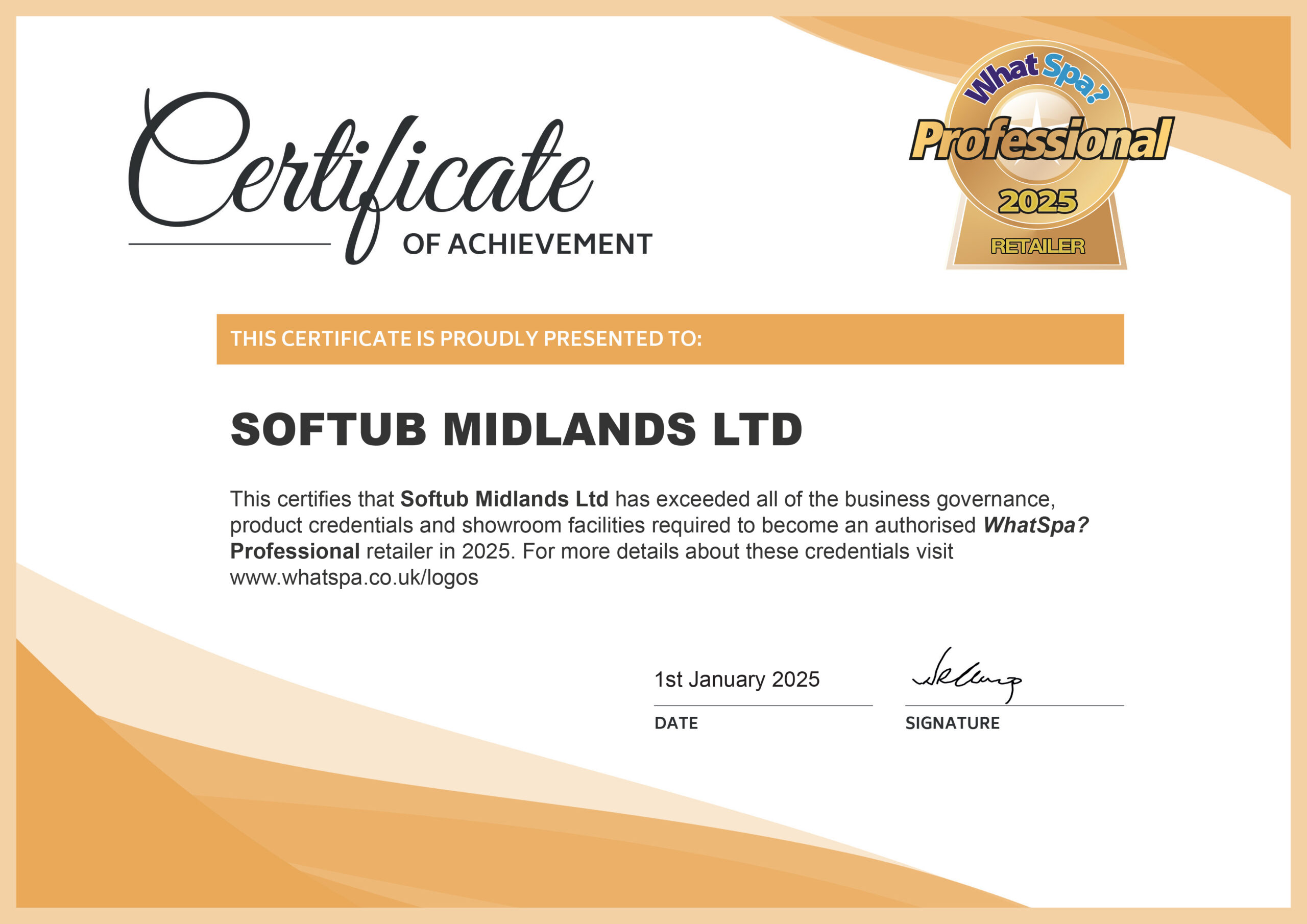 Softub Midlands is a WhatSpa? Professional retailer. See our current certificate of approval here.