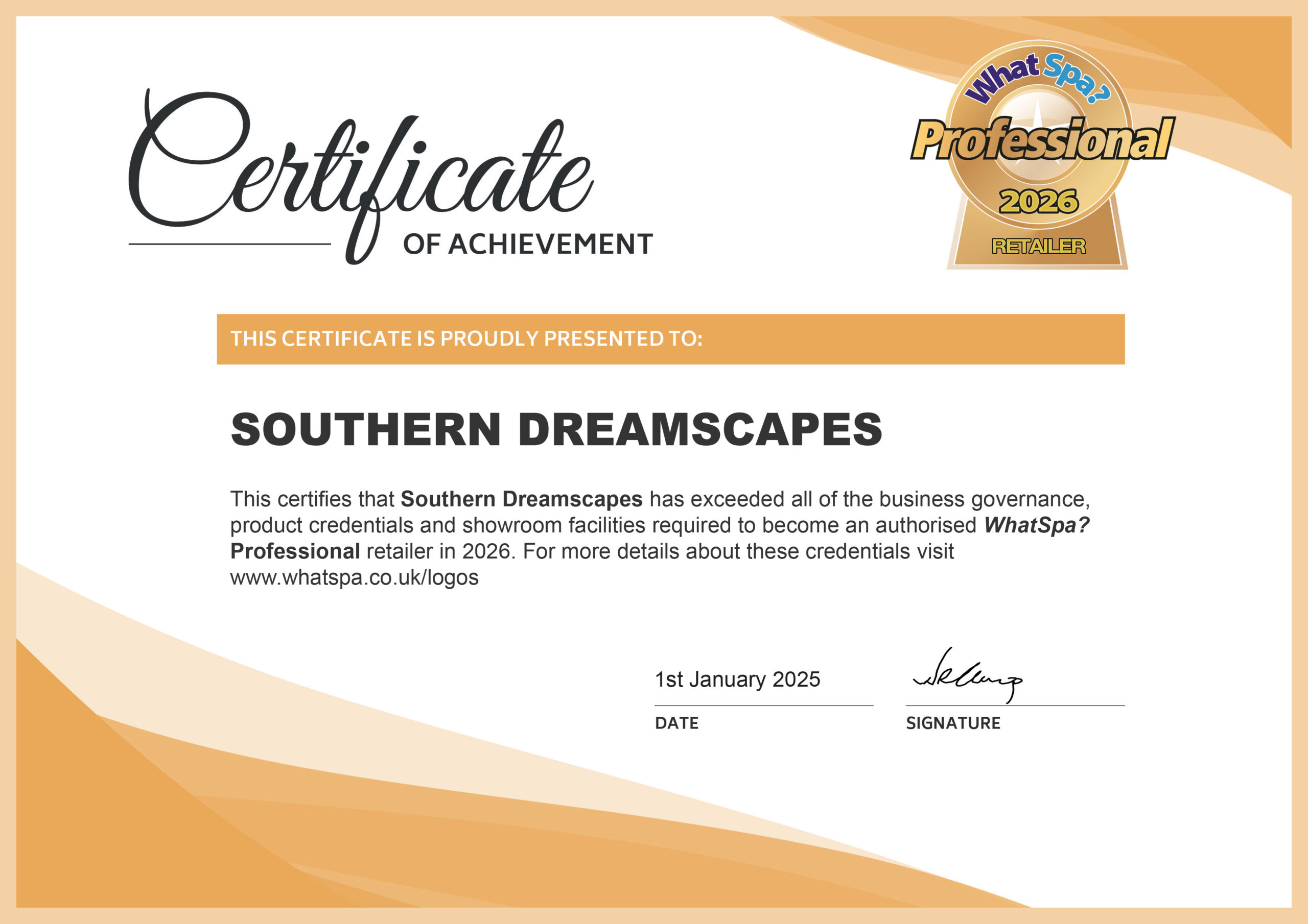 Southern Dreamscapes is a WhatSpa? Professional retailer. See our current certificate of approval here.