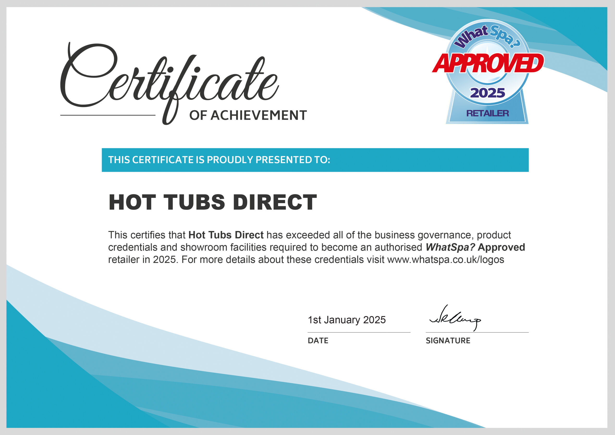 Hot Tubs Direct is a WhatSpa? Approved retailer. See our current certificate of approval here.